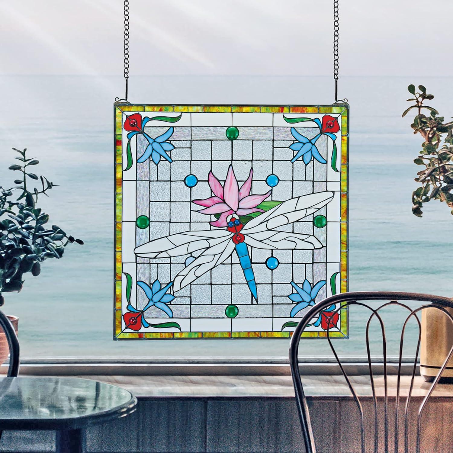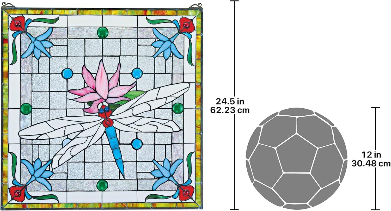 Design Toscano Stained Glass Panel – Dragonfly Pond 24”W x 24.5”H Wall Hanging, Blossom Pink, Handcrafted Stained Glass Sculpture