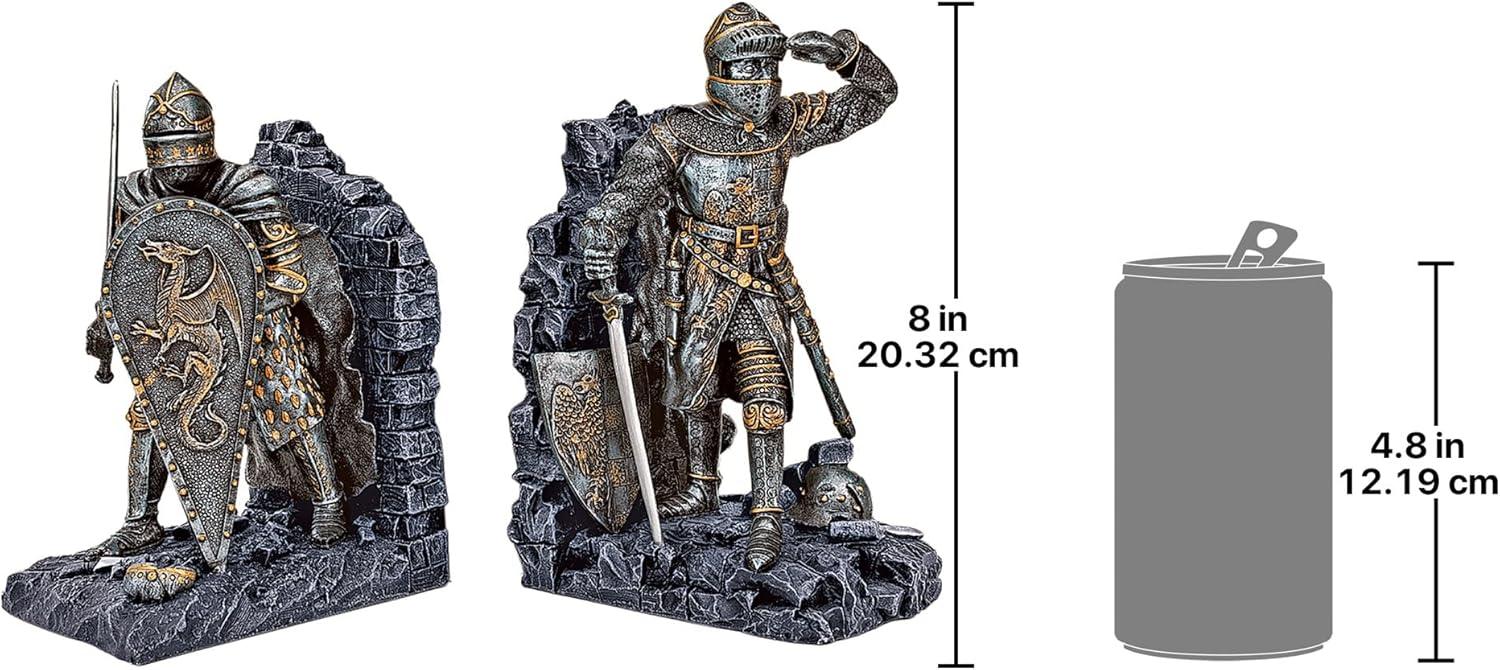 BATTLE READY – From the romantic pages of Arthurian legends come this highly detailed bookend set featuring the lord's fierce knights ready to battle a dragon with a sword or hold off would-be literary thieves with a shield
