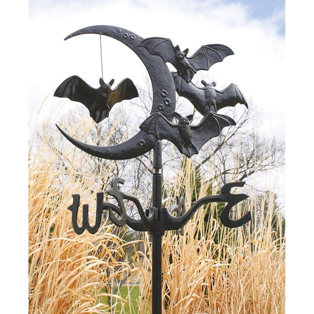 Bats Take Flight – Eerie bats fly around a crescent moon and stylized directionals in this hand-crafted metal weathervane that shows you which way the wind is blowing