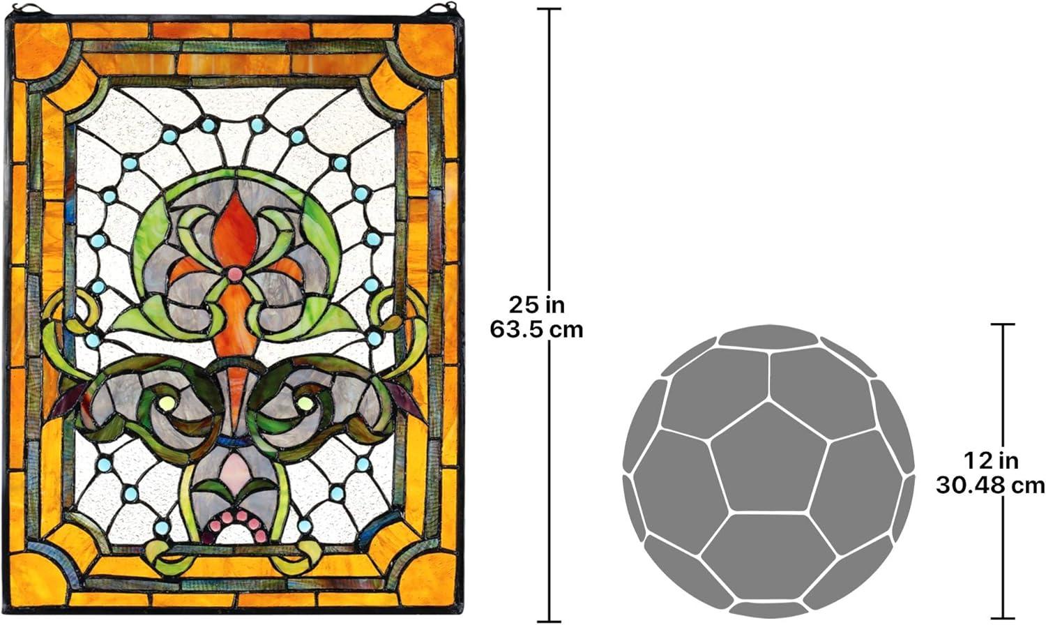 Design Toscano Elmslie Arts and Crafts Stained Glass Window, Green & Amber Geometric(Kendall Manor Window)
