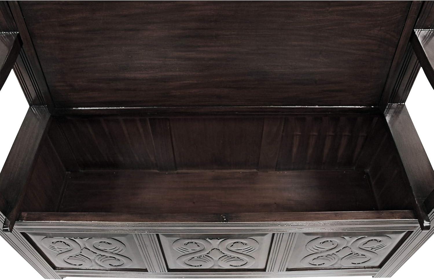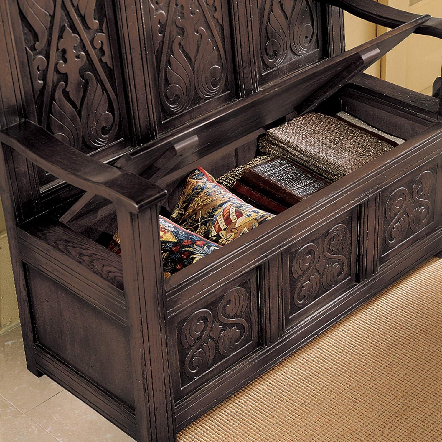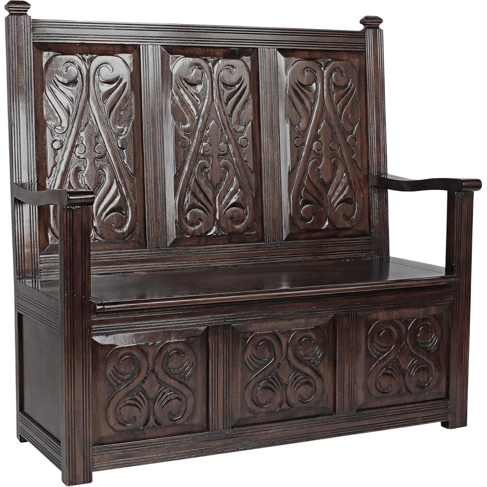 Our favorite English antique dealer agreed to have this stunning medieval Monk's Bench reproduced for us complete with all its rich, handcarved details. Clergy members used it to store vestments before the advent of closets. Both stylish and functional, this heavyweight, high-back bench with carved panels, provides seating for two, and deep storage for items such as fine linens, books or treasures from a bygone era. For authentic character, it takes over two weeks to hand carve and hand-finish the solid mahogany to replicate the original antique. A Toscano exclusive. Simple assembly required. 48″Wx21″Dx48″H. 90 lbs.