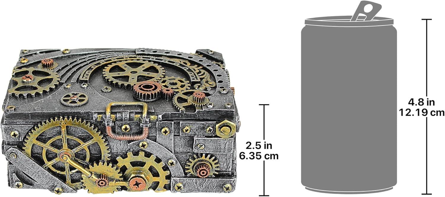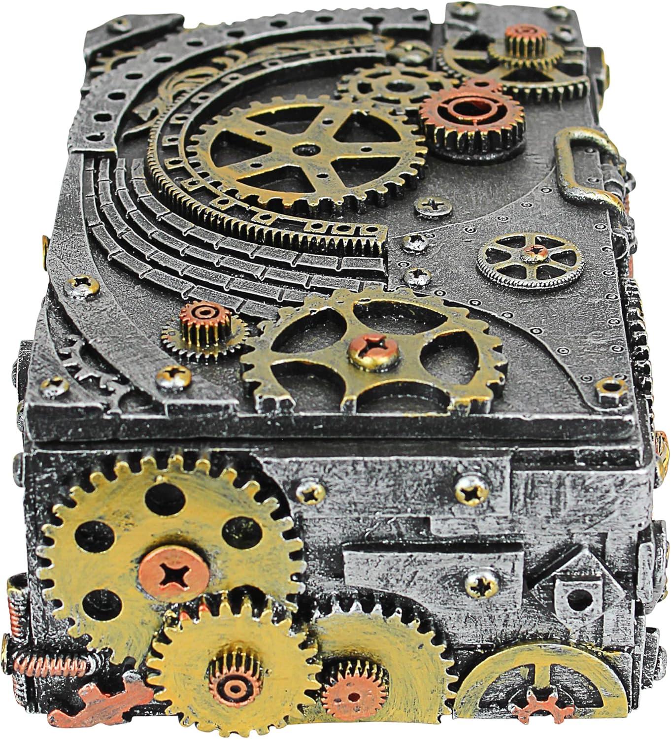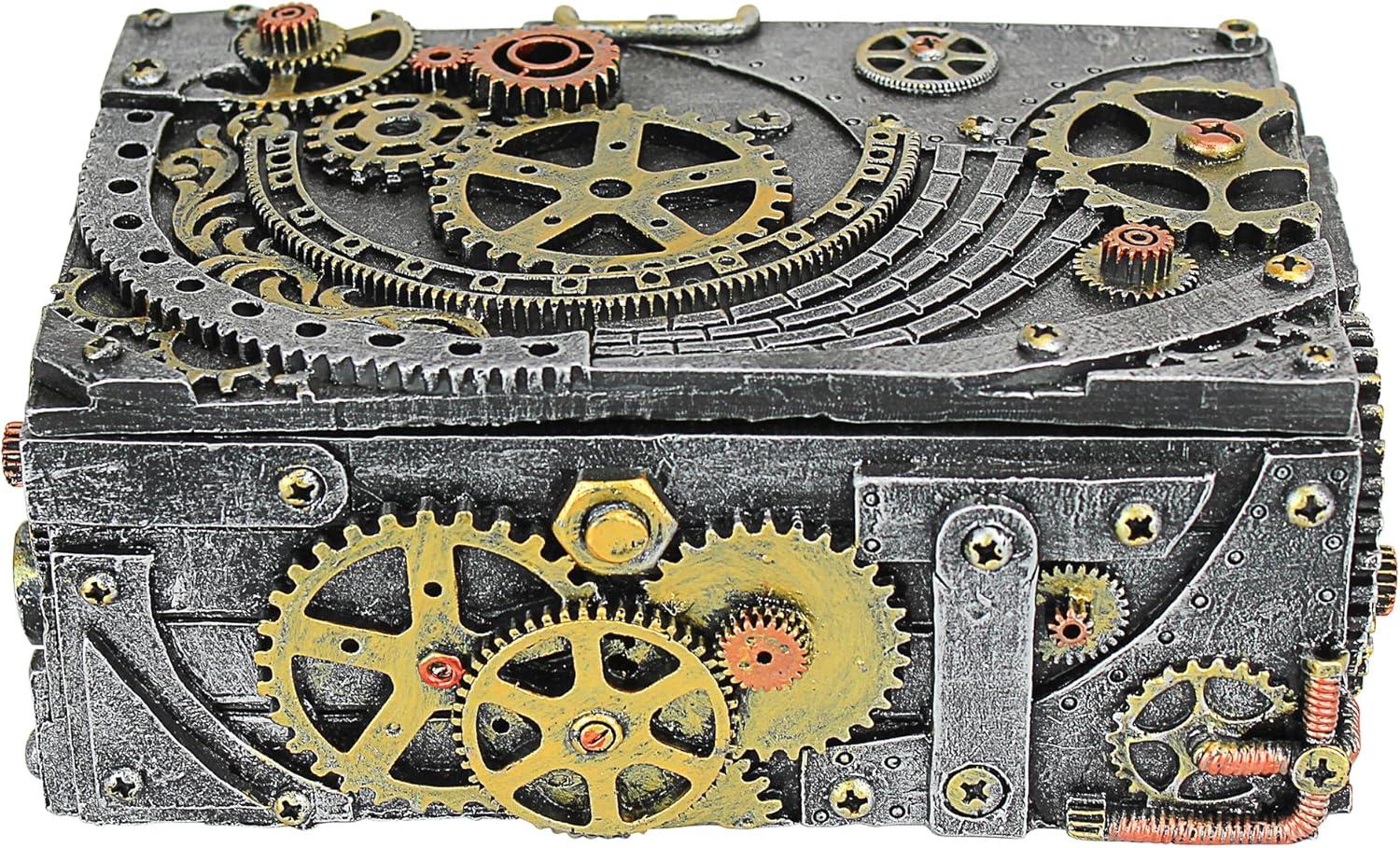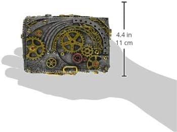 Increase your daily torque with this Steampunk gearbox! Expertly sculpted with detailed drivetrain elements from clutch to prop shaft, this handy, lidded box will increase your high rotational speed and put your drive wheels in motion as you start your engine and get ready for each new day. Cast in quality designer resin and hand painted with a multi-hued, faux metallic finish, this mechanical sculptural gear box is a Design Toscano original destined for your favorite gearhead. Start your engines! 6½ “Wx4½ “Dx2½ “H. 2 lbs.