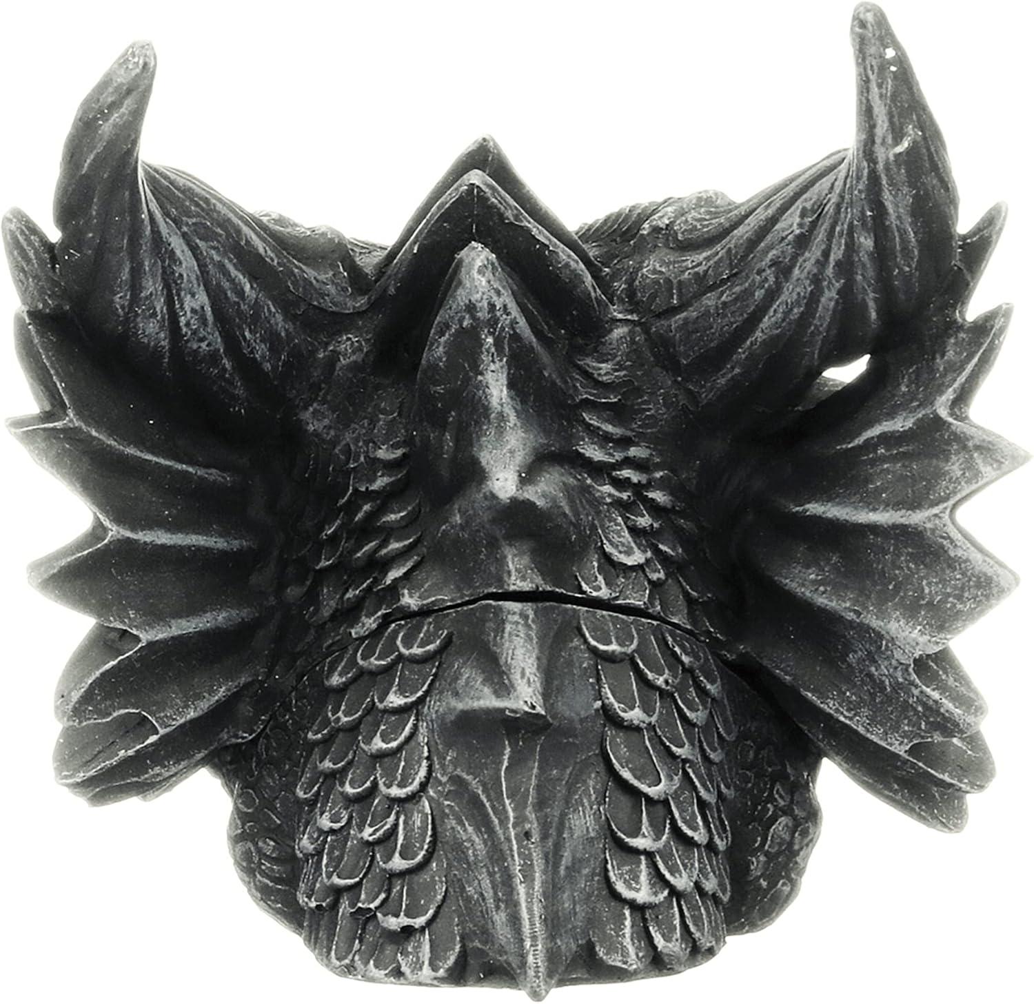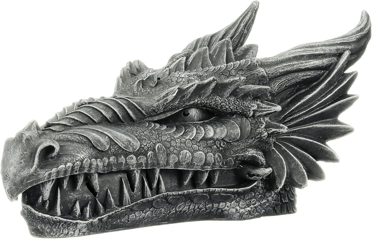 Fragrant incense smoke rises from the vented nostrils of this absolutely awesome fire-breathing dragon sculpture, lending mystery to any Medieval decor. Raise the upper jaw of our fierce, Gothic skull statue to stash your extra sticks. Our fiery sculpture is cast in quality designer resin with a dark Gothic grey stone finish. 10½”Wx5½”Dx5″H. 2 lbs.