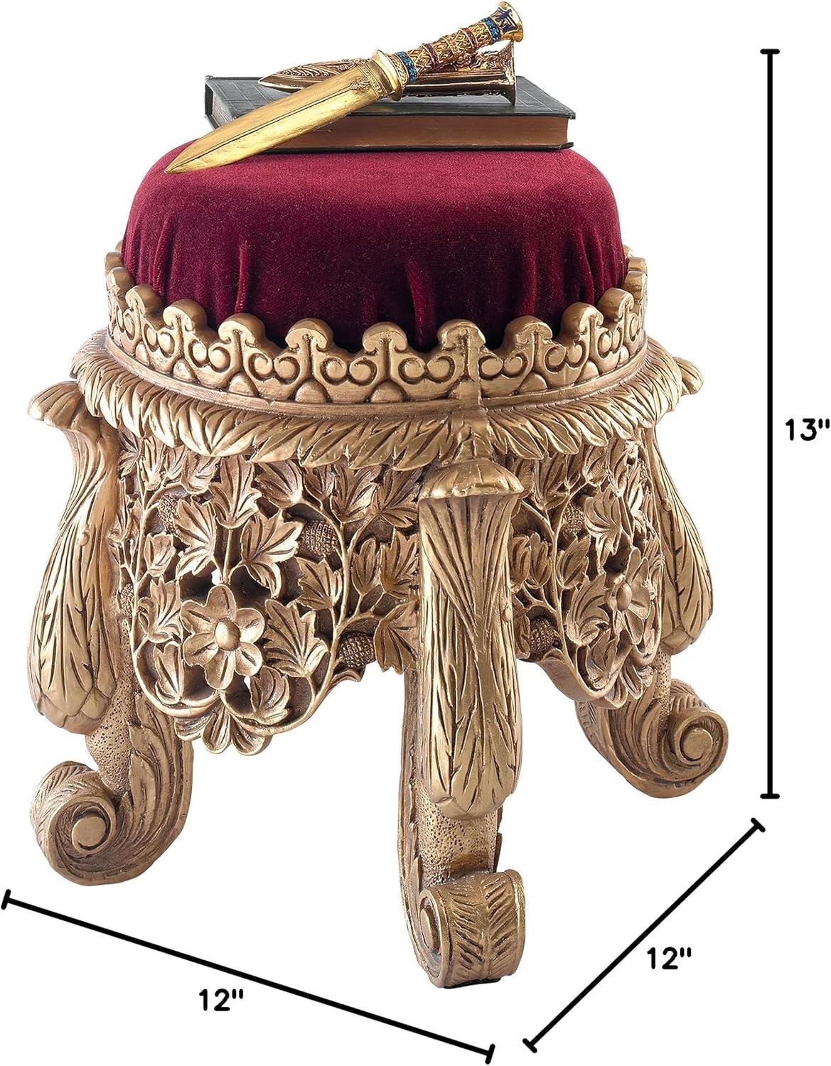 Act like a sultan by propping your feet on a replica of his decorative furniture foot stool! A celebration of the exotic carvings of a distant land, the ornate fretwork of this replica accent piece is fraught with leaves and flowers that rise from sturdy legs toward a deeply cushioned, richly-colored ruby red velvet upholstered cushion. Cast in quality designer resin and finished in an antiqued gold hue, this stylish work of furniture decor replicates a 16th century stool owned by Sultan Suleiman, the longest-reigning sultan of the Ottoman empire. This Design Toscano original is as functional as it is decorative. 12″dia.x13″H. 12 lbs.
