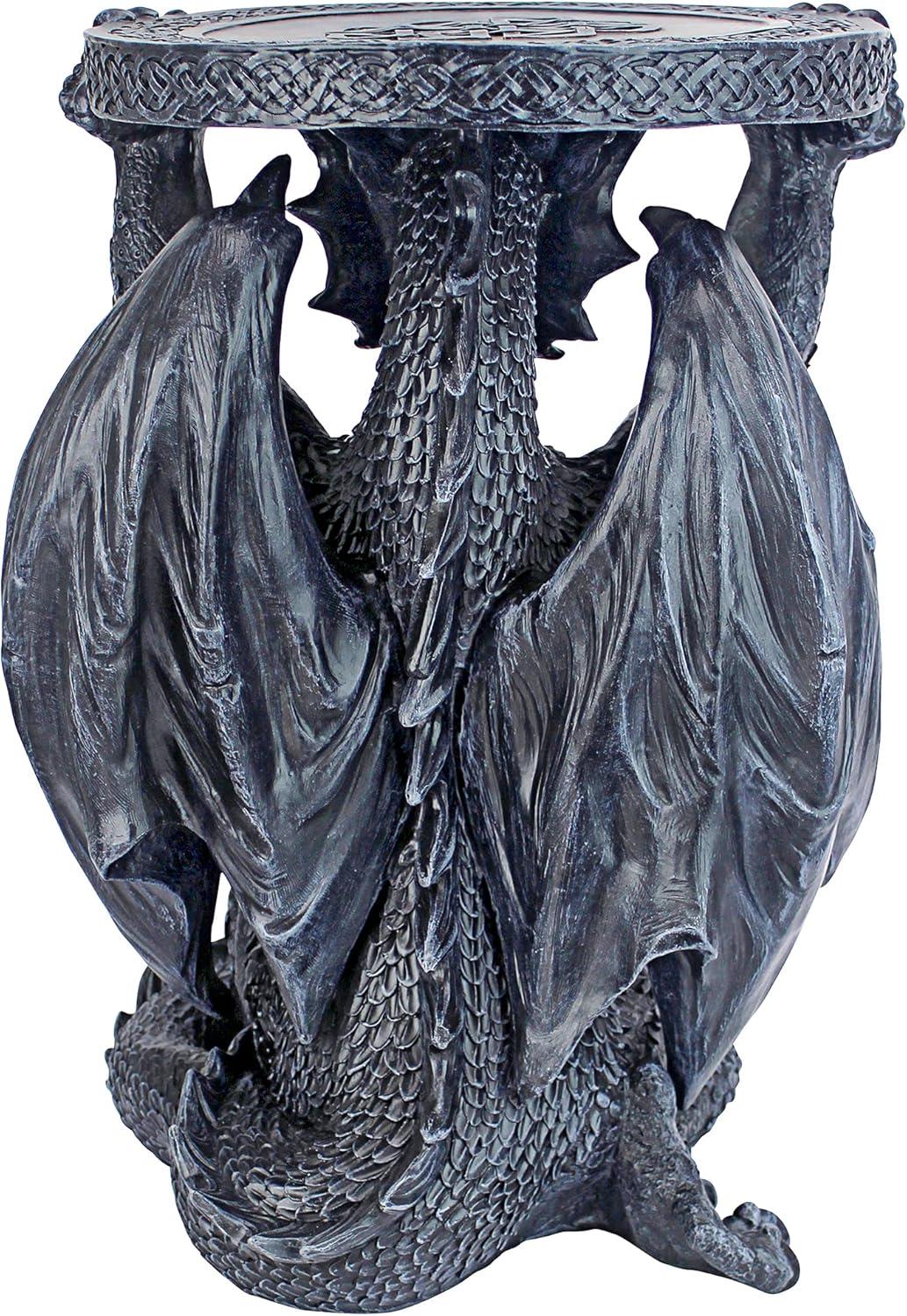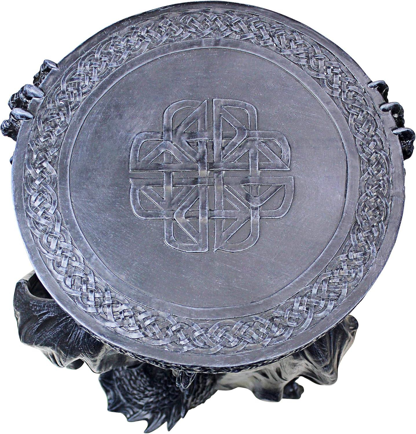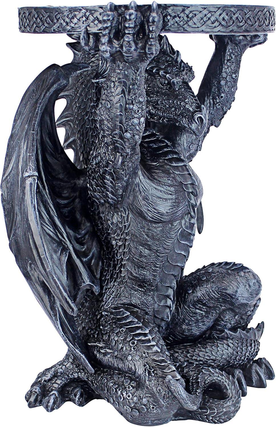 Presenting its war shield as a tabletop and a sign of peace, the Gothic Dragon of Netherley Boggs submits to your command by keeping your Medieval tankards, modern gaming controllers or other collectibles close at hand. Cast in quality designer resin to capture details from the mystical Celtic knot designs on top and sides to the fierce musculature of this monster beast, our dramatic Design Toscano original boasts a dark faux gray stone finish. Our almost 2-foot tall sculptural work is just the stalwart you want guarding your home or garden! 14½”Wx13½”Dx20½”H. 21 lbs.